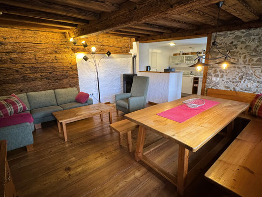 Das Wohnzimmer mit 10er-Esstisch, Sofaecke und Sat-TV und vollausgestatteten Küche lädt zum gemütlichen Zusammensitzen ein.